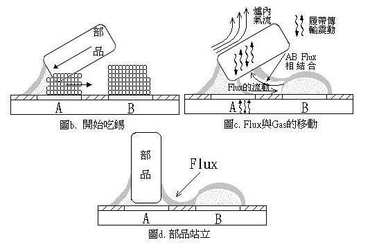 SMT片式元件在遭受急速加熱情況下發(fā)生的翹立,這是因?yàn)榧睙崾乖啥舜嬖跍夭?,電端邊的焊料完全熔融后獲得良好的濕潤,而另邊的焊料未完全熔融而引起濕潤不良,這樣促進(jìn)了元件的翹立。因此,回流焊加熱時(shí)要從時(shí)間要素的角度考慮,使水平方向的加熱形成均衡的溫度分布,避免急熱的產(chǎn)生。