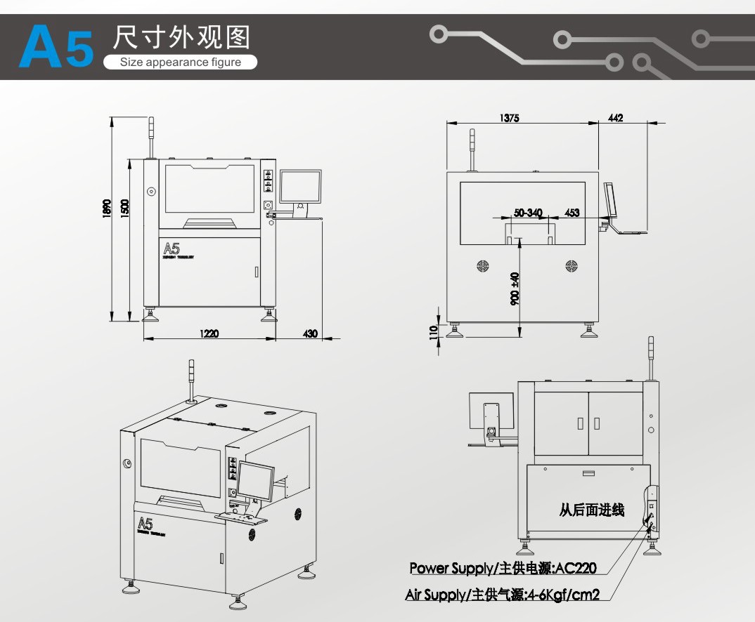A5系列是一款高精度全自動錫膏印刷機(High?PrecisionAuto?Paste?Printer)。在表面組裝工藝生產(chǎn)(SMT)中,用于高精度的鋼網(wǎng)印刷或漏版印刷的專用生產(chǎn)設(shè)備。
