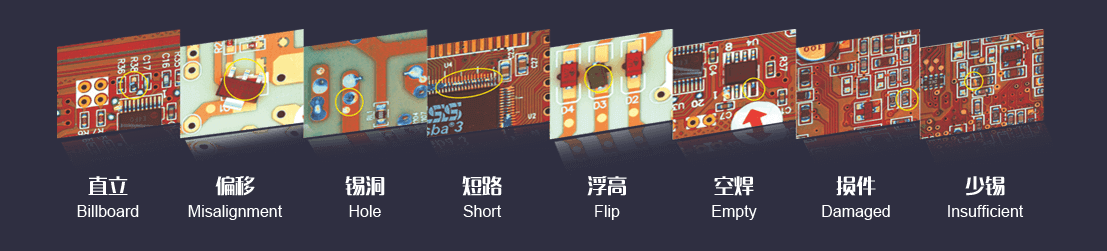 檢測覆蓋類型 | 偏移、少錫、短路、污染、缺件、歪斜、立碑、側(cè)立、翻件、錯件、破損、浮高、極性、虛焊、 空焊、溢膠、錫洞、引腳未出等 |