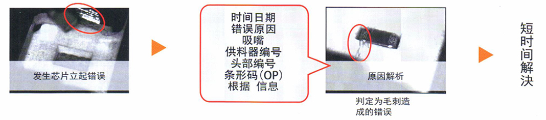過在貼片頭部內(nèi)安裝超小型攝相機(jī),可以實時取得吸取/貼片的圖像,實現(xiàn)了吸取與貼片時的檢查,還能保存追溯信息。
